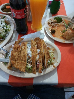 ¿Ya había hablado del Doc verdad? Es mi hermanhijo, ha convivido conmigo desde que era un bebé, pues bien, nos invitó a un lugar donde venden la tradicional cena, es decir antojitos mexicanos. Estos son unos tacos dorados con milanesa de res, muy ricos.